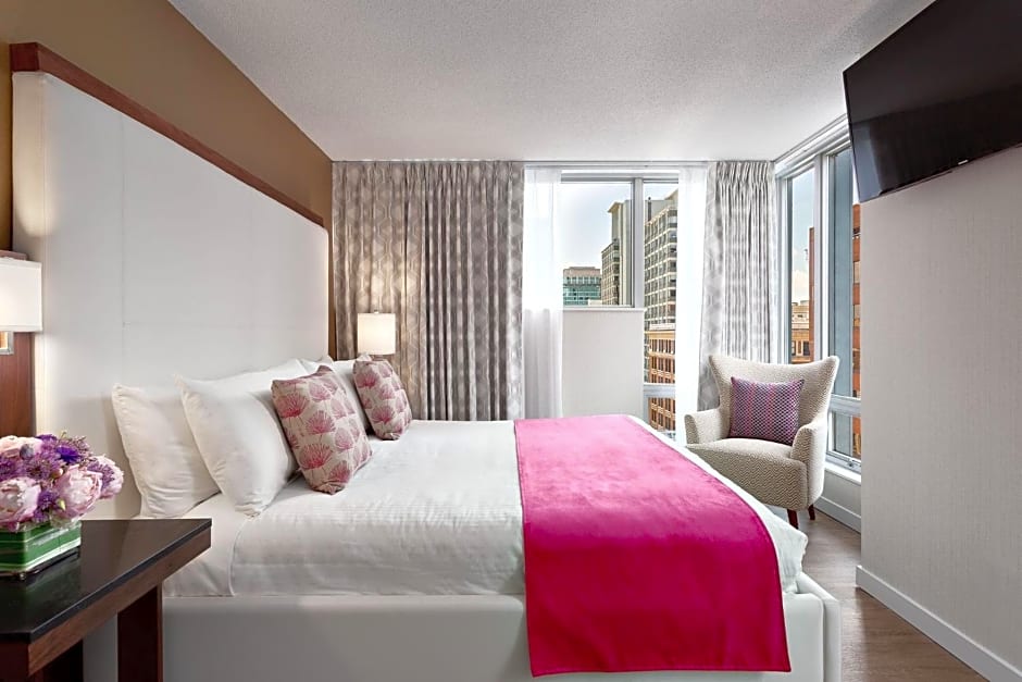 A flat-screen cable TV and a sofa bed are provided in the separate living room in this spacious suite. A mini refrigerator, microwave, Keurig coffee maker, and dining table are included. City views are featured. Free WiFi is included.